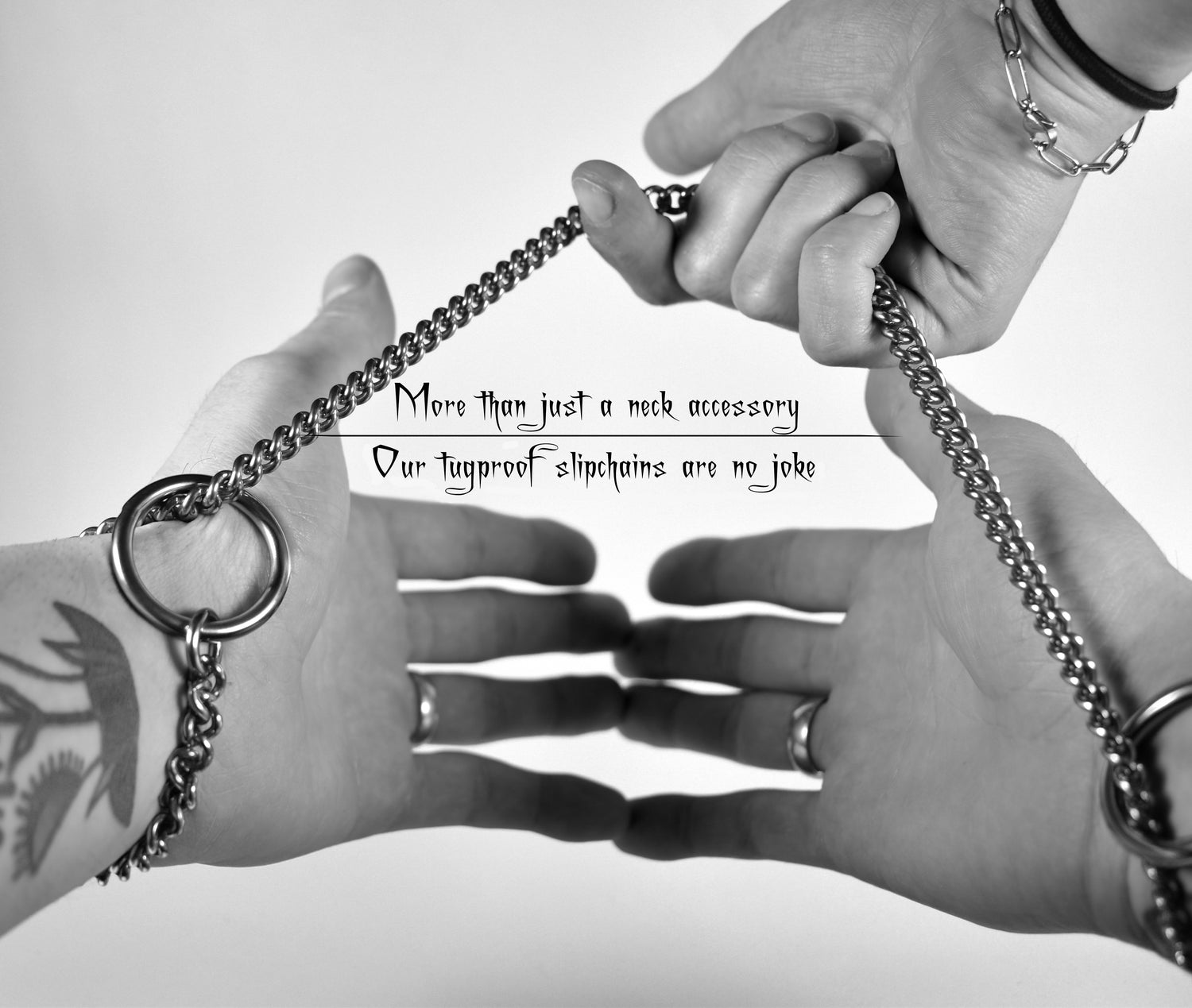 Our slipchains are tougher than anywhere else! They can be used as a choker, as a leash and even as handcuffs. Talk about convenience! :)